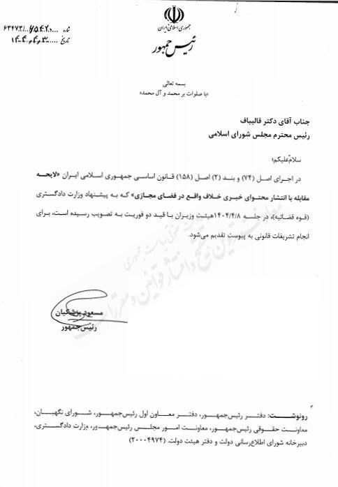 مسعود پزشکیان روز ۳۰تیر۱۴۰۴ (۲۱جولای۲۰۲۵)، با امضای نامهای خطاب به محمدباقر قالیباف، رئیس مجلس شورای اسلامی، «لایحه مقابله با انتشار محتوای خبری خلاف واقع در فضای مجازی» را با قید دو فوریت به مجلس ارسال کرد. در مقدمه دلایل توجیهی این لایحه آمده است: «با توجه به گسترش ابزارهای ارتباطی نوین و توسعه دامنه جریان تولید و انتشار اطلاعات، اخبار و محتوای خبری در فضای مجازی … و با عنایت به تبعات منفی ناشی از نشر محتوای خبری تحریفشده و خلاق واقع که عموما با اهدافی مانند ضربهزدن به حیثیت اشخاص، آسیب به امنیت روانی، عوامفریبی، بیاعتبارسازی نهادهای حاکمیتی و گزارشهای رسمی، ایجاد ترس و وحشت عمومی، برهمزدن اجتماعی و تضعیف انسجام ملی صورت میگیرد … لایحه مقابله با انتشار محتوای خبری خلاف واقع در فضای مجازی برای طی مراحل تشریفات قانونی به تقدیم میگردد.»