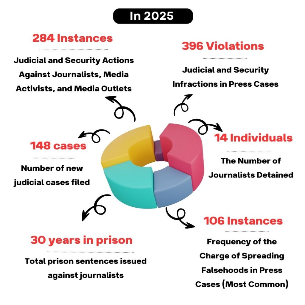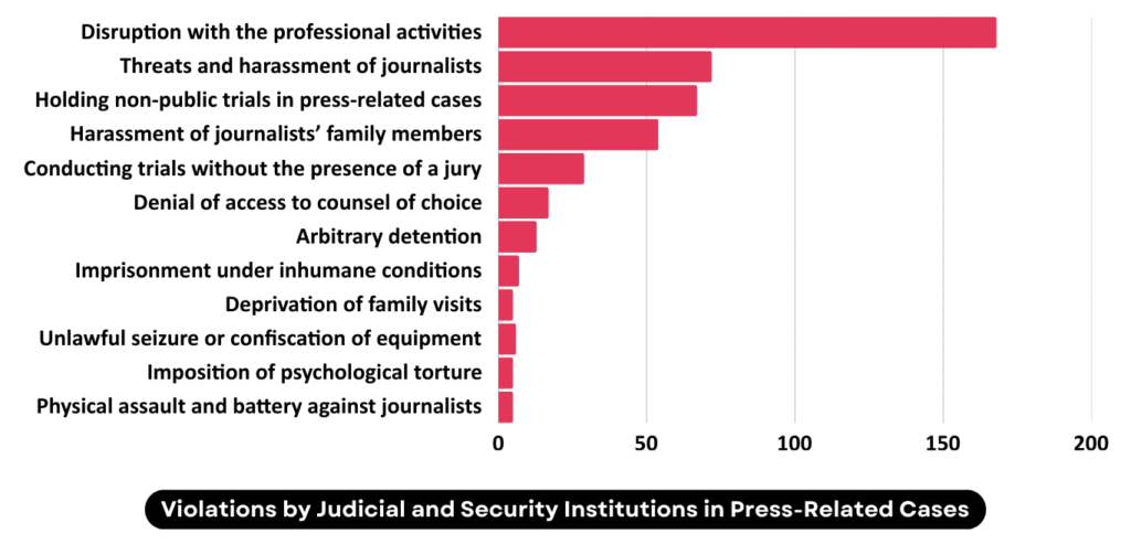 Other violations in press cases during 2025 included holding press trials without a jury, arbitrary detention of journalists and media activists, imprisonment under inhumane conditions, denial of access to chosen legal counsel, depriving imprisoned or detained journalists of family visits or phone contact, seizure or confiscation of journalists’ personal belongings without judicial orders, psychological torture of detainees through prolonged solitary confinement, physical assault on journalists by judicial officers or individuals affiliated with government and security institutions, and extralegal seizure of media outlets.