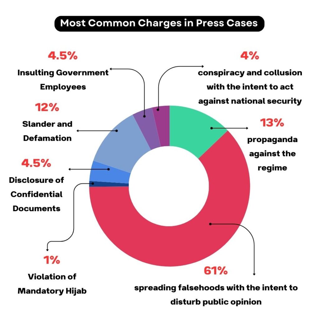 - “Spreading falsehoods” ( نشر اکاذیب) was the most frequently attributed charge, used in 106 cases against journalists and media outlets.
